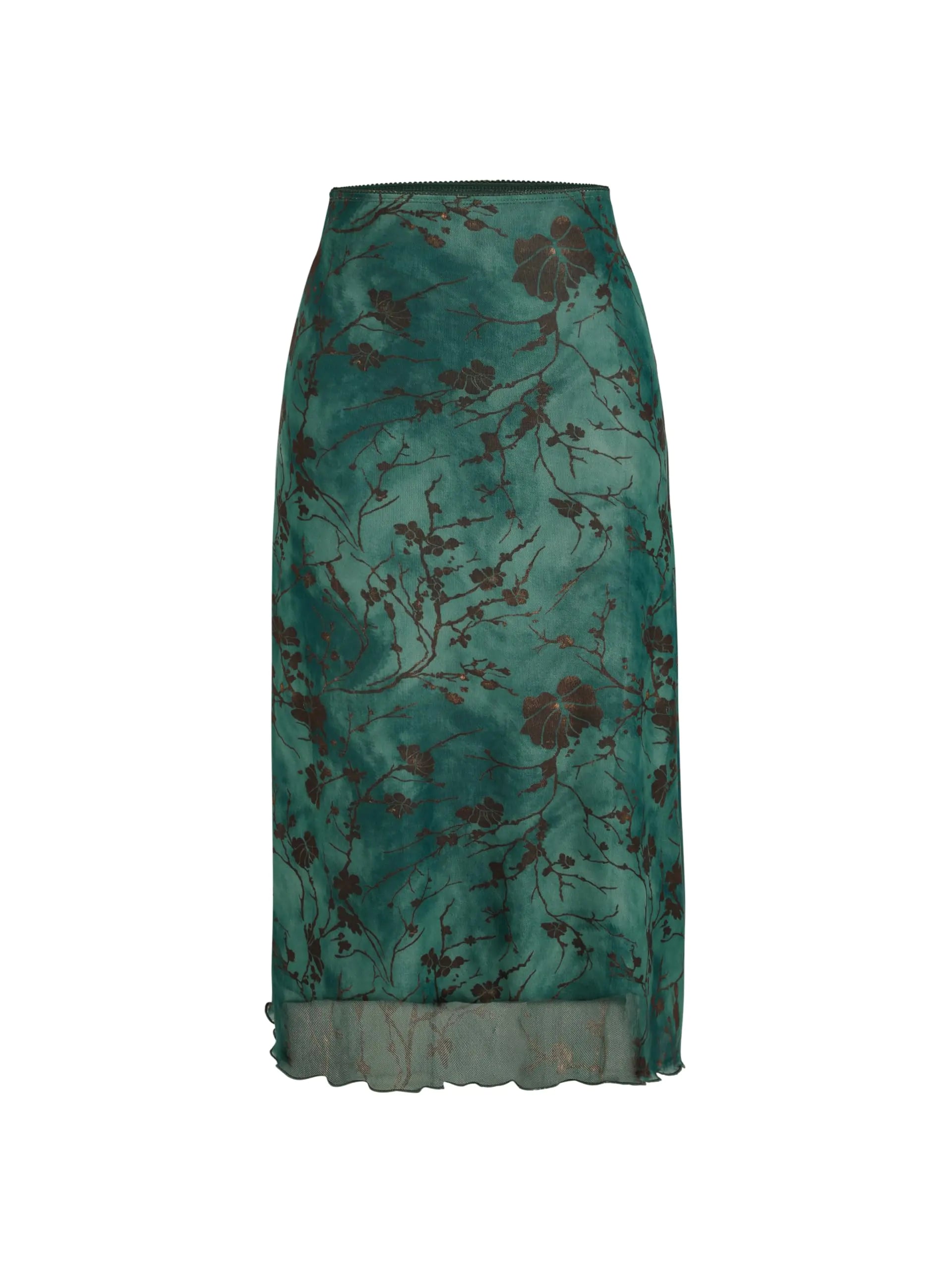High Waist Mesh Floral Midi Skirt features a delicate and sophisticated floral pattern that exudes a sense of elegance and femininity.